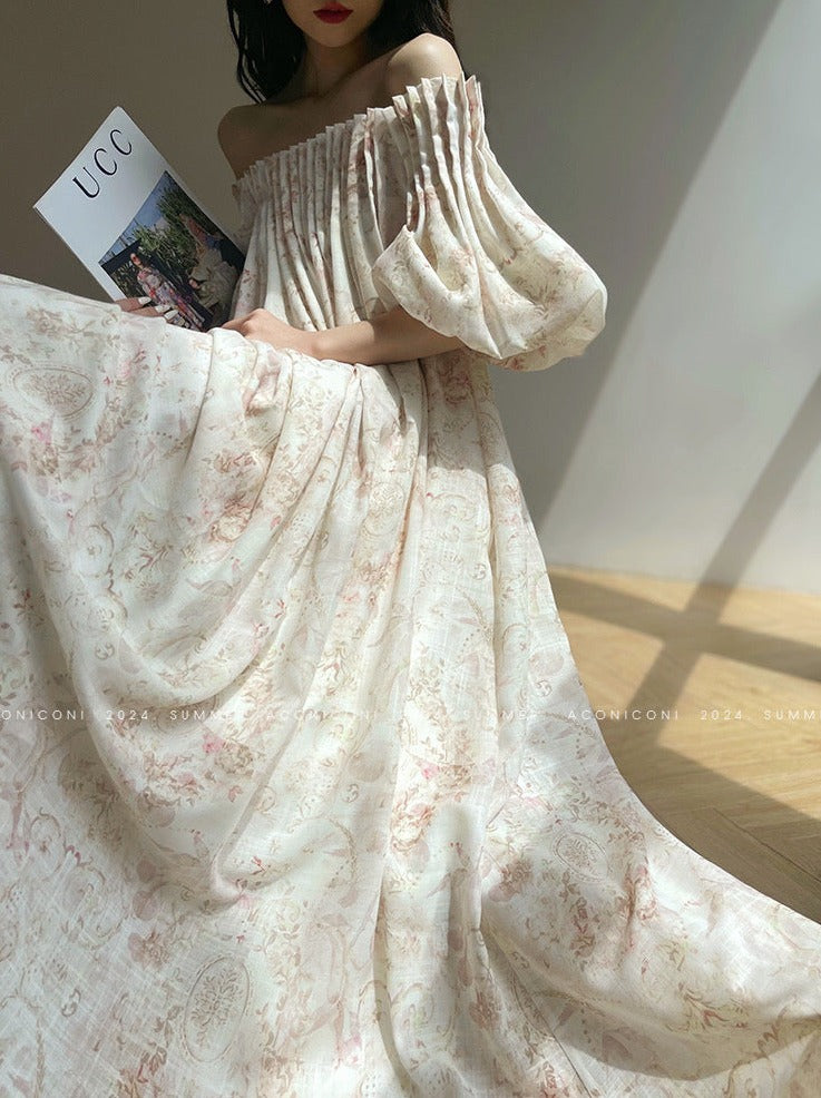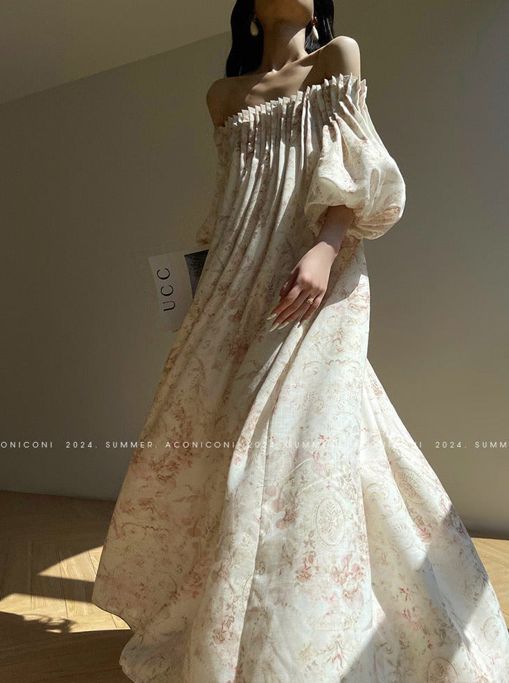 Aconiconi| French Retro Print Off-Shoulder Long Dress