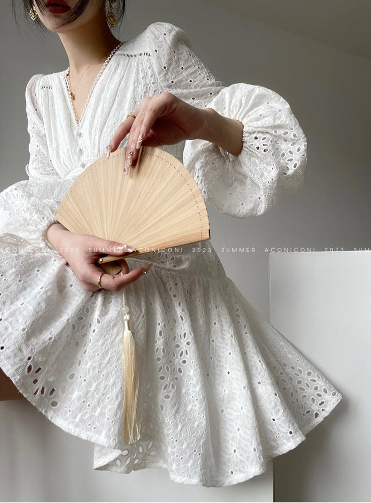 Aconiconi|White Indigo Smoked Lace Cotton Dress