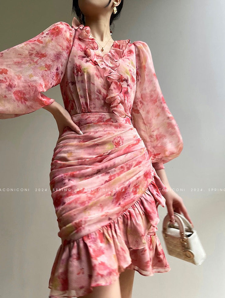 Aconiconi | Vivid Floral V-neck Ruffle Dress